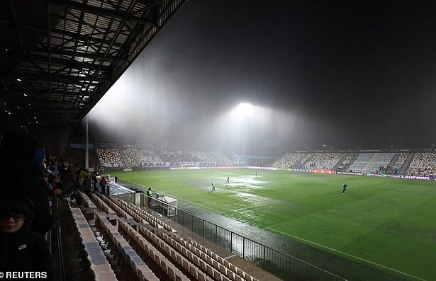 Conference League clash suspended after only 12 MINUTES after torrential rain leaves enormous puddles on pitch