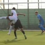 While Carolyn was explaining how thrilled she was with the ‘dream’ draw against the Gunners, which will take place on the weekend of March 7, one of their sons ran behind the shot head-to-toe in Arsenal kit.