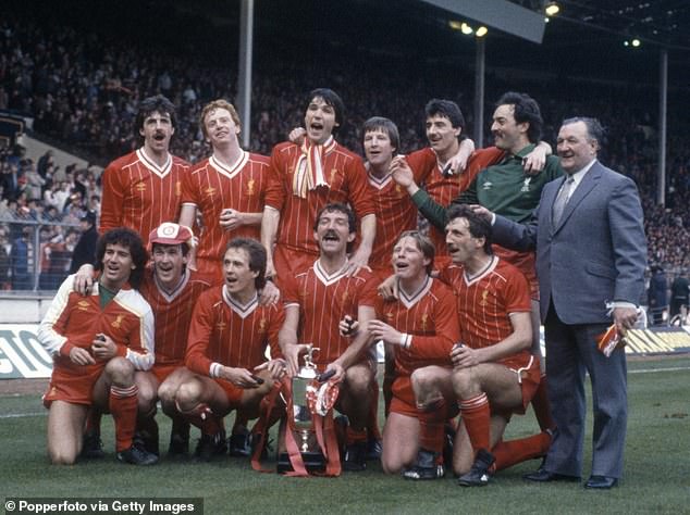 From left to right: John Wark, David Hodgson, Paul Walsh, Ronny Rosenthal, Kenny Dalglish, Terry McDermott, Jan Molby, Alan Kennedy, Leon Lawler (son of Chris), David Fairclough and Liverpool executive Jonathan Bamber after the EFL game against Southampton
