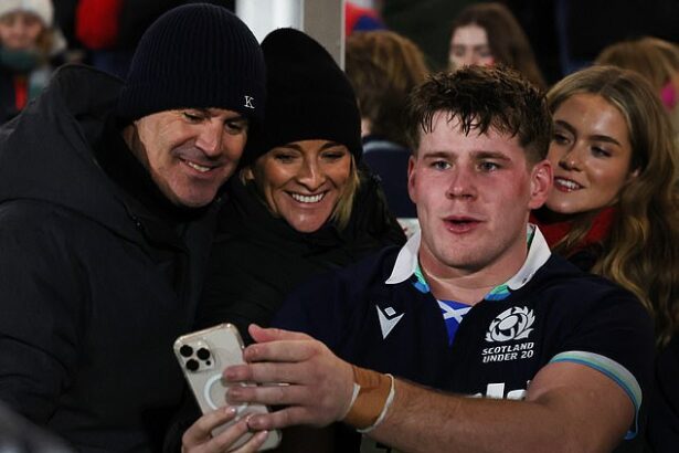 Gabby Logan’s rugby player son, 20, says her sex life revelations are being played in his team gym as he begs her to stop discussing her ‘daily romps’