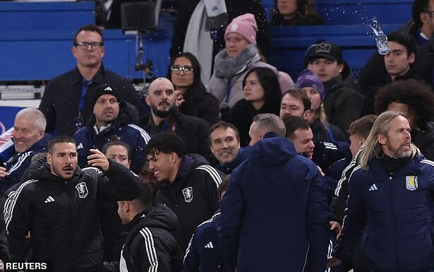 Chelsea launch investigation after water bottle ‘thrown close to Blues’ dugout’ soaks Aston Villa stars during post-match celebrations with emotions running high after Stamford Bridge defeat