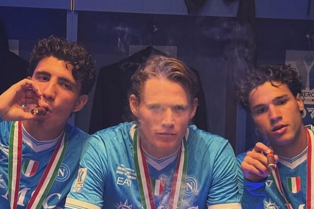 The big smoke! Scott McTominay lights up a cigar in the changing room after winning his second trophy at Napoli
