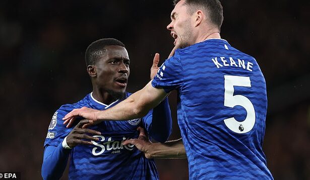 Everton star is sent off against Man United after SLAPPING his own teammate in moment of madness – but Gary Neville insists midfielder should not have seen red despite ‘unsavoury’ clash