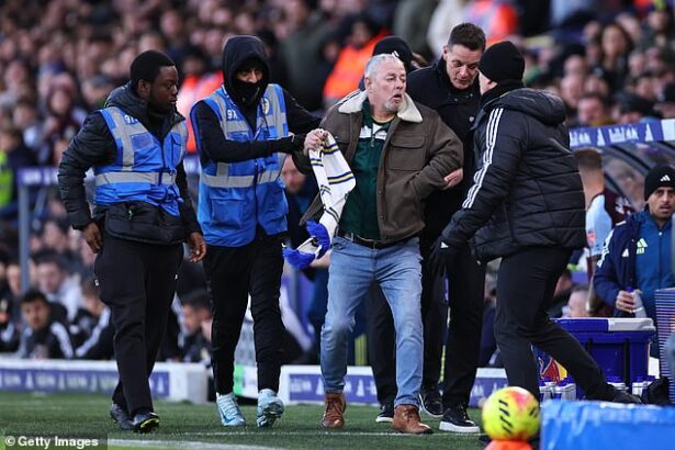 Angry Leeds fan tries to confront Daniel Farke and is led away by stewards as tempers boil over at Elland Road after defeat by Aston Villa