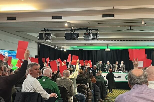 Celtic’s annual general meeting ABANDONED after angry fans jeer board and wave red cards at top table