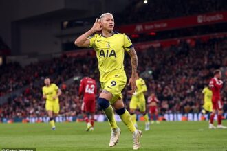 When asked if Vinicius had ‘incited’ Benfica’s players and fans with his exuberant celebration, Mourinho said: ‘Yeah, I believe so. The words they exchange, Prestianni with Vinicius, I want to be independent. I don’t comment about it.’
