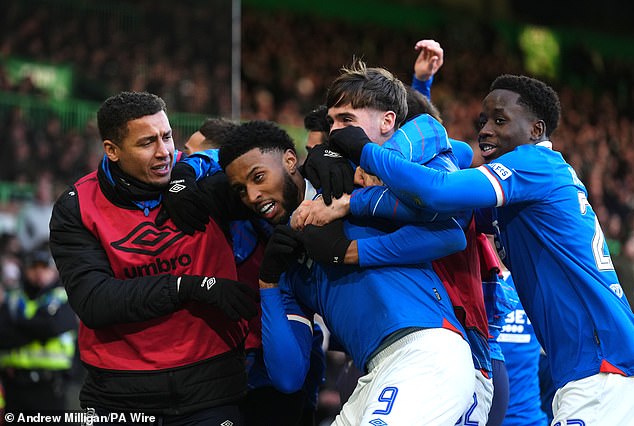 Mikey Moore races away in celebration after hitting Rangers’ third and rubber-stamping victory