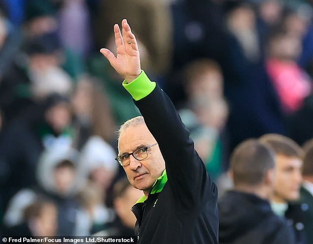 Martin O’Neill waves to the fans after presiding over his fourth consecutive Premiership win