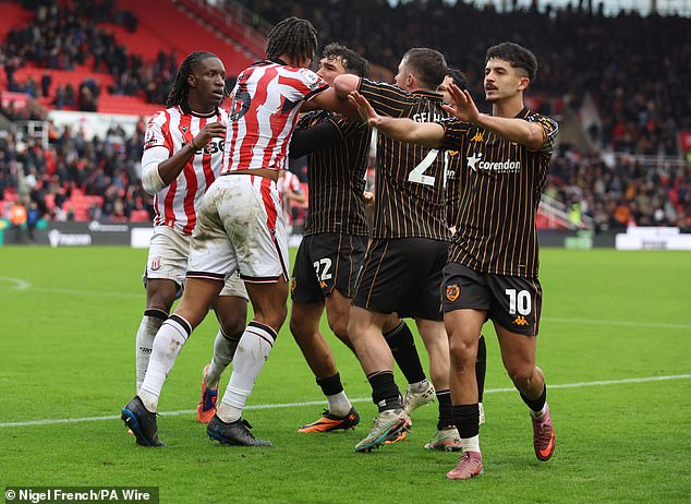 Stoke and Hull’s Championship clash ended in an on-pitch brawl sparked by the latter’s celebrations after scoring a last minute winner.