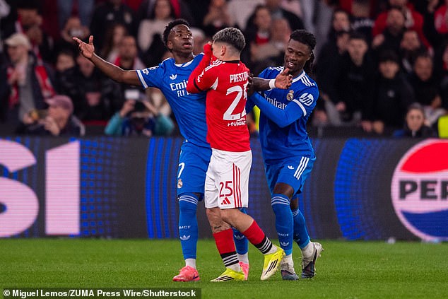 Real Madrid star Vinicius Jr (left) accused Benfica’s Gianluca Prestianni of racially abusing him in the first leg of their Champions League clash in February
