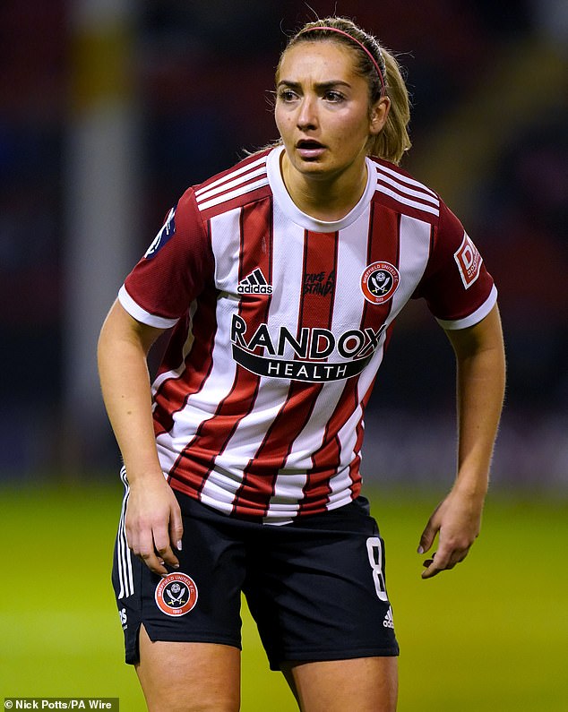 Cusack, who was Sheffield United Women’s vice-captain, was found dead at her home in September 2023 (pictured above – fans pay tribute to Cusack in September 2025)
