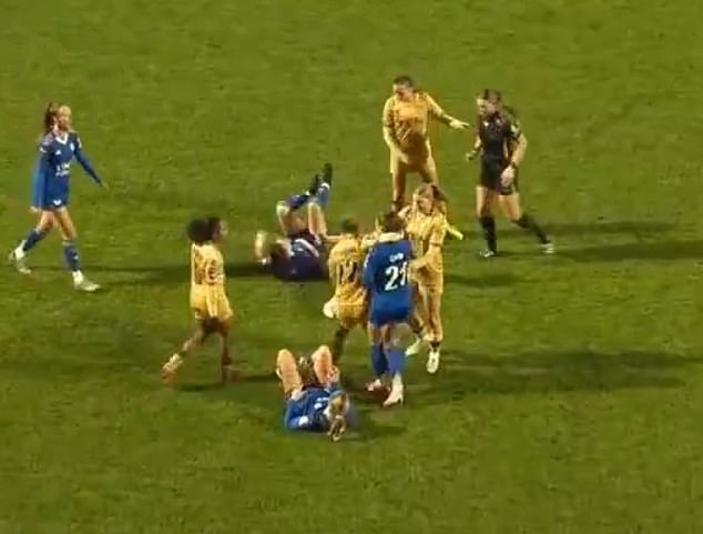 One fan wrote: ‘The player already down could have been kicked in the head by Cain’s foot as she got dragged down, what an idiot for endangering multiple players.’