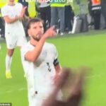 And the Portuguese’s complaints didn’t stop there. He appeared to direct some of his anger at the Irish dugout, seemingly mouthing ‘well done’ in one video before former Chelsea defender Ricardo Carvalho held him back.
