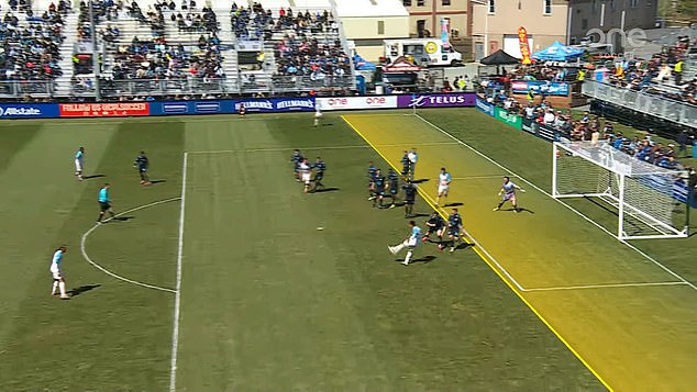 Arsene Wenger’s new ‘daylight’ offside rule was used for the first time on Saturday when Alejandro Diaz (second top of screen in light blue shirt) scored for Pacific FC in Canada