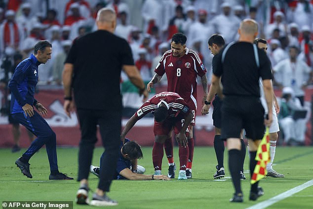 Qatar midfielder Assim Madibo went to check on his manager as he was the one who had smashed the ball at him as a result of a full blooded challenge on the touchline.