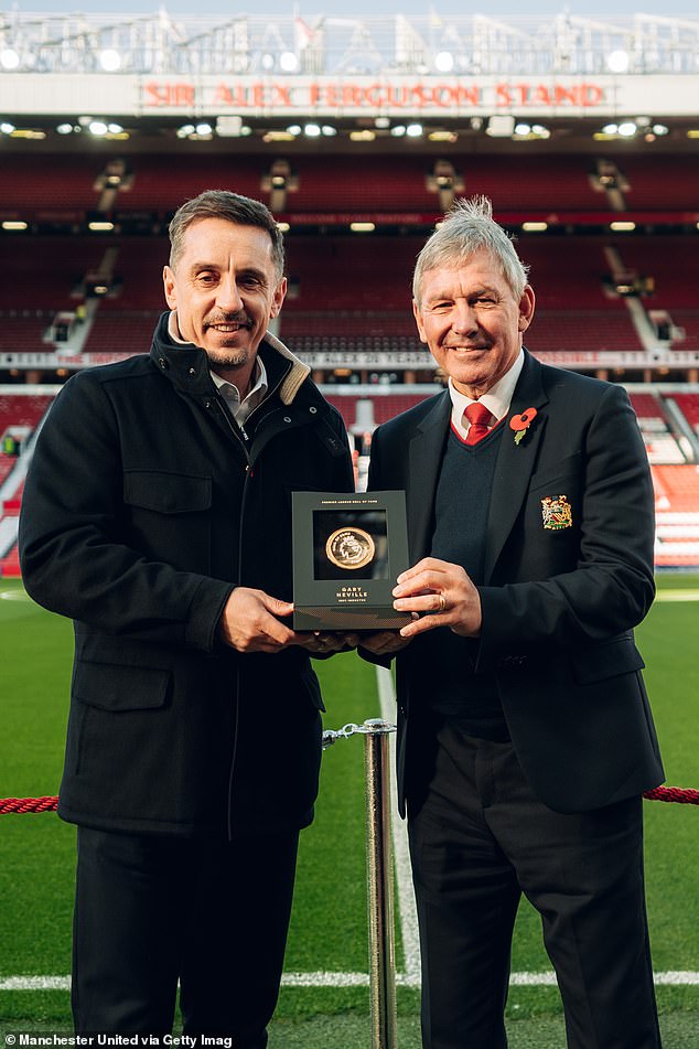 Neville, who won the Premier League eight times in his career, was presented with a Hall of Fame medallion by United legend Bryan Robson at Old Trafford ahead of the Red Devils’ clash against Brighton to mark the moment.