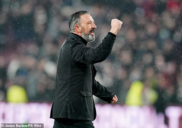 Derek McInnes celebrates at the end of a pulsating derby, which ended in victory for Hearts