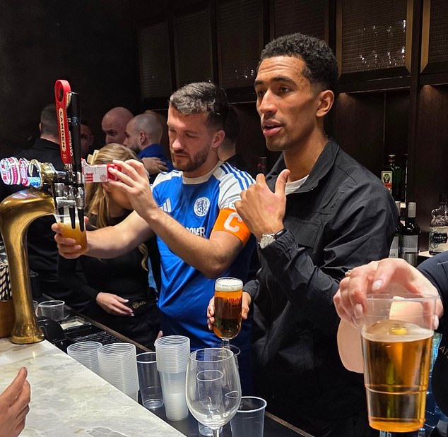 Macclesfield FC captain Paul Dawson (left), pictured still in his kit and pulling pints after his side’s famous win over Crystal Palace, was shovelling snow last Tuesday night
