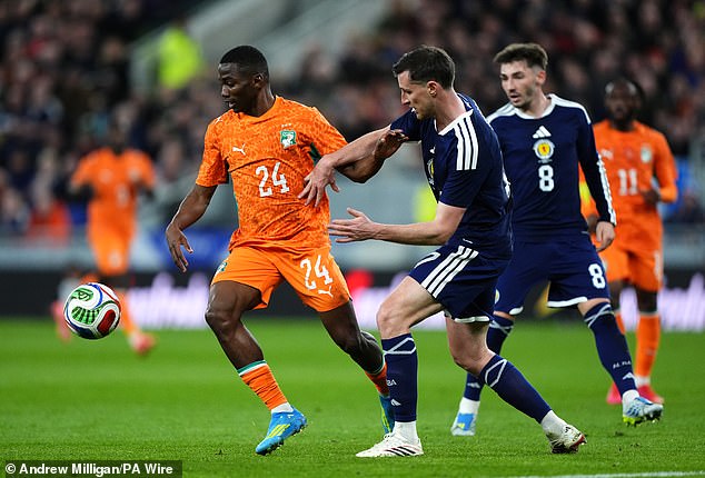 Caleb Yirenkyi battles Germany and Liverpool’s Florian Wirtz in a friendly last month