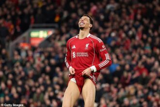 Carragher said: ‘I looked at the left backs and O’Reilly has done brilliant. But it is the glaring position – I am a huge fan of Lewis Hall. I was looking at Lewis-Skelly… I thought he would be playing in this team, but he doesn’t play for Arsenal.