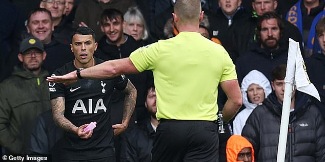 Pedro Porro shows the vape thrown from the stands to referee Thomas Bramall on Saturday