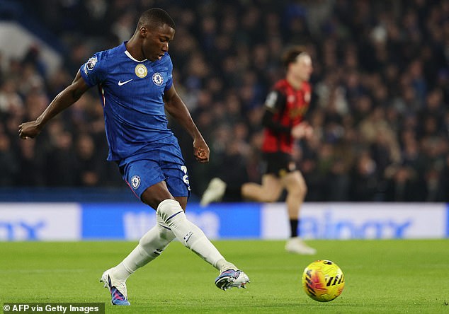 The Chelsea star was shown his fifth booking of the season by match referee Sam Barrott after clipping the heels of Bournemouth’s Adrien Truffert (not pictured) near the halfway line