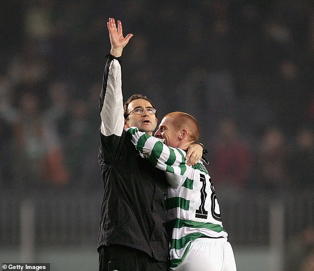 O’Neill and Lennon embrace after Celtic draw with Barcelona at the Nou Camp in 2004