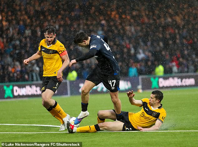 Rangers boss Rohl wasn’t convinced by the decision as he reflected on a missed opportunity to keep up the pressure on league leaders Hearts. ‘For me, it’s a clear foul,’ he said. ‘I think it’s on the line. And then it’s two decisions. If it’s outside, it’s a red card and a free kick. If it’s inside, then it’s a penalty and a yellow card.