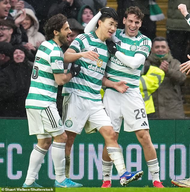 Yang feels the love from his Celtic team-mates after scoring twice against Motherwell