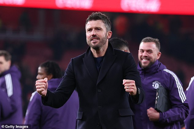 Manchester United head coach Michael Carrick celebrates victory over Arsenal on Sunday, following on from a win over Manchester City in his first game in charge
