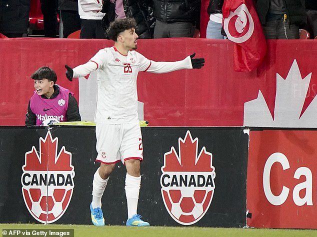 Celtic winger Sebastian Tounekti celebrates his goal for Tunisia against Haiti in Toronto