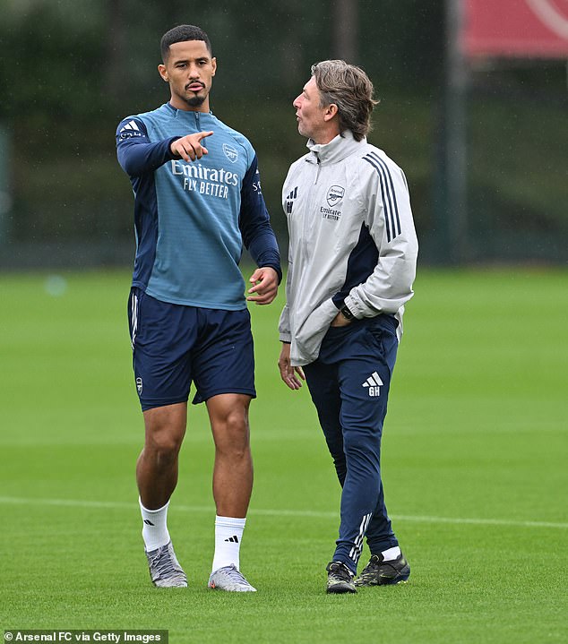 Gabriel Heinze and William Saliba (left) talk defensive tactics in an Arsenal training session