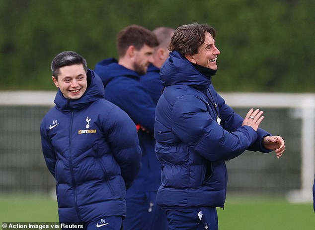 The Spurs boss was among the first out on to the pitch, preceded only by freshly appointed assistant John Heitinga and goalkeeper Guglielmo Vicario.