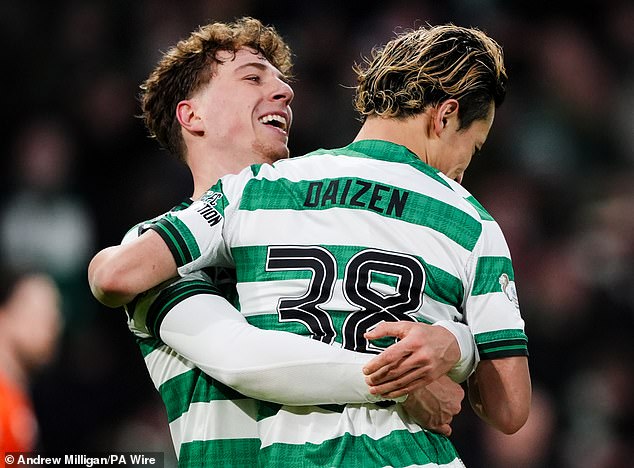 Arne Engels is all smiles as he gives fellow Celtic goalscorer Daizen Maeda a lift at Parkhead