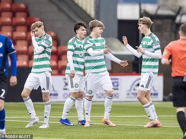 Celtic’s B team players celebrate a 3-1 victory over Cumbernauld Colts on Saturday