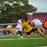 Tom Pickford of Celtic launches into a tackle on Cumbernauld opponent Jay Gillies
