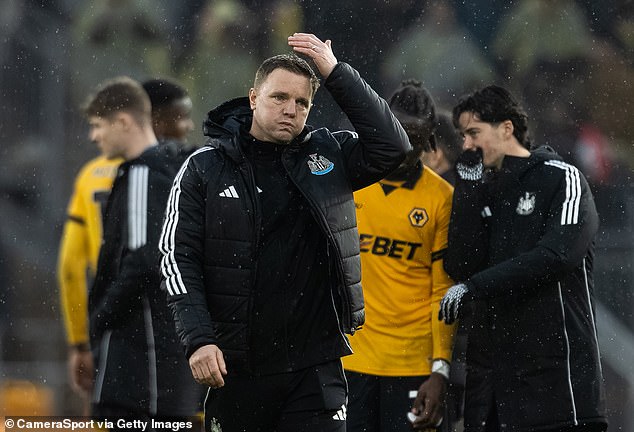 When asked after the game at Molineux whether the Saudi-owned club would look to bolster the attacking line with any moves in January, Howe replied: ‘I don’t think we have the financial ability to do that.’