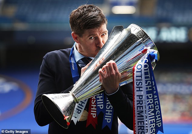Steven Gerrard kisses the Scottish Premiership trophy after leading Rangers to title in 2021